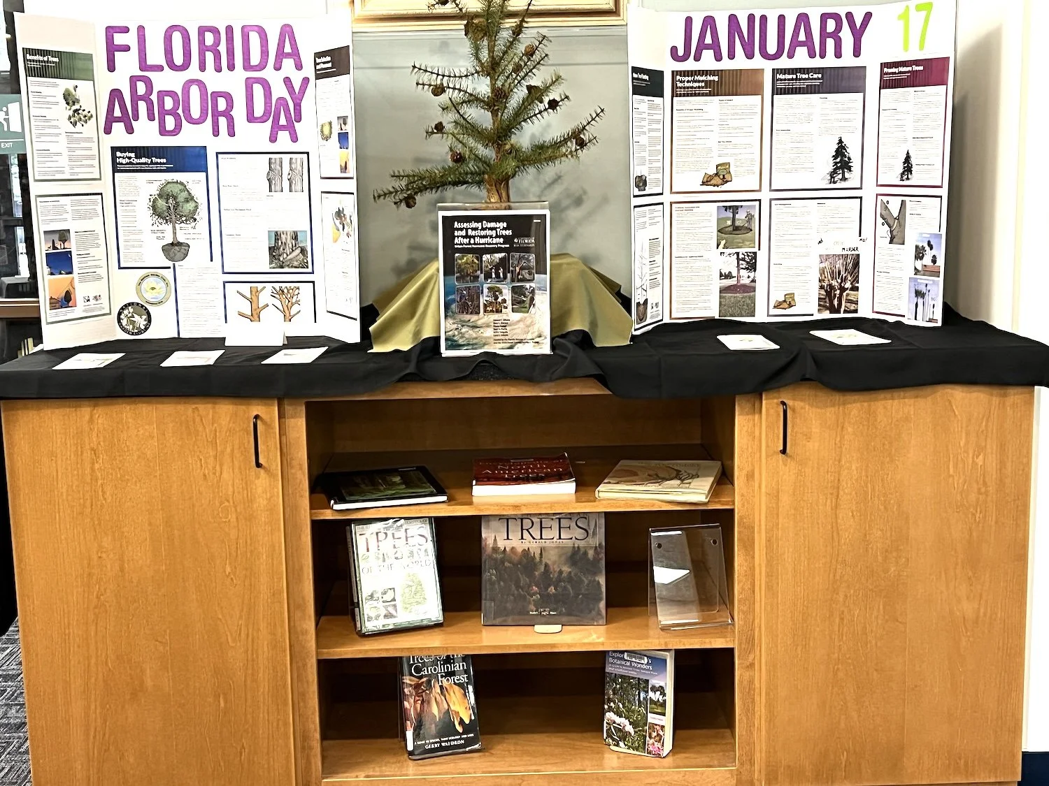 Our 2025 Florida Arbor Day exhibit was placed in the Fernandina Beach public library the week of January 17 and after. Tree-related books were provided by the library and available for check out. The COFB conservation department provided phamphets for the taking which covered myriad topics such as how to select, plant, mulch and maintain trees. This was an opportunity to emphasize the important role trees play in our maritime ecosystem.