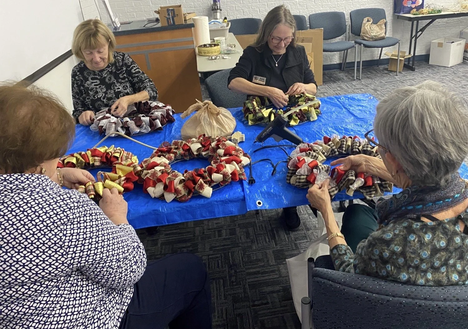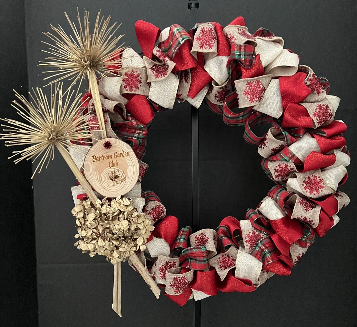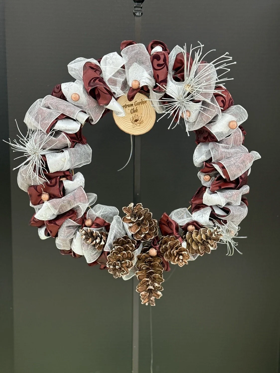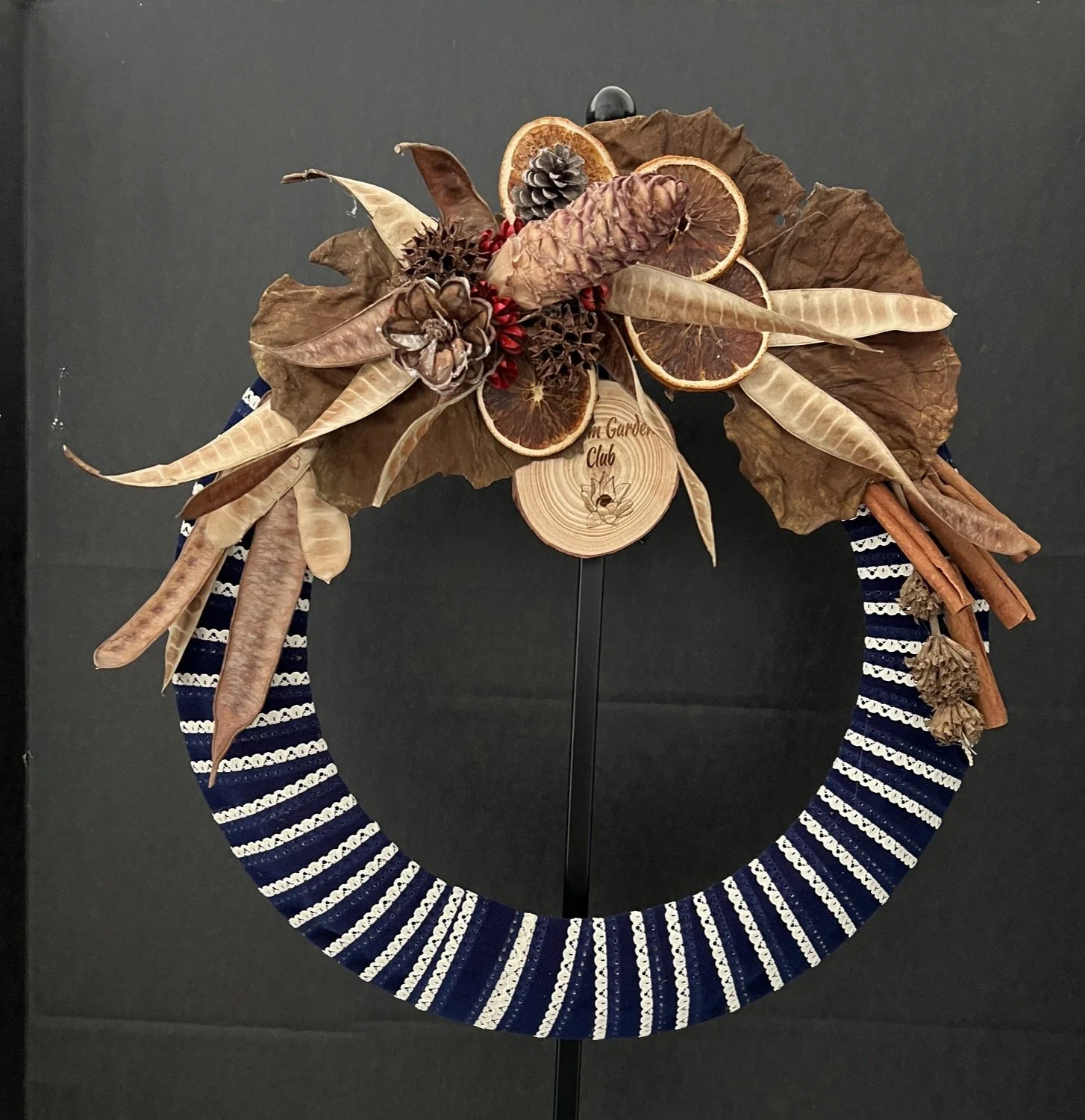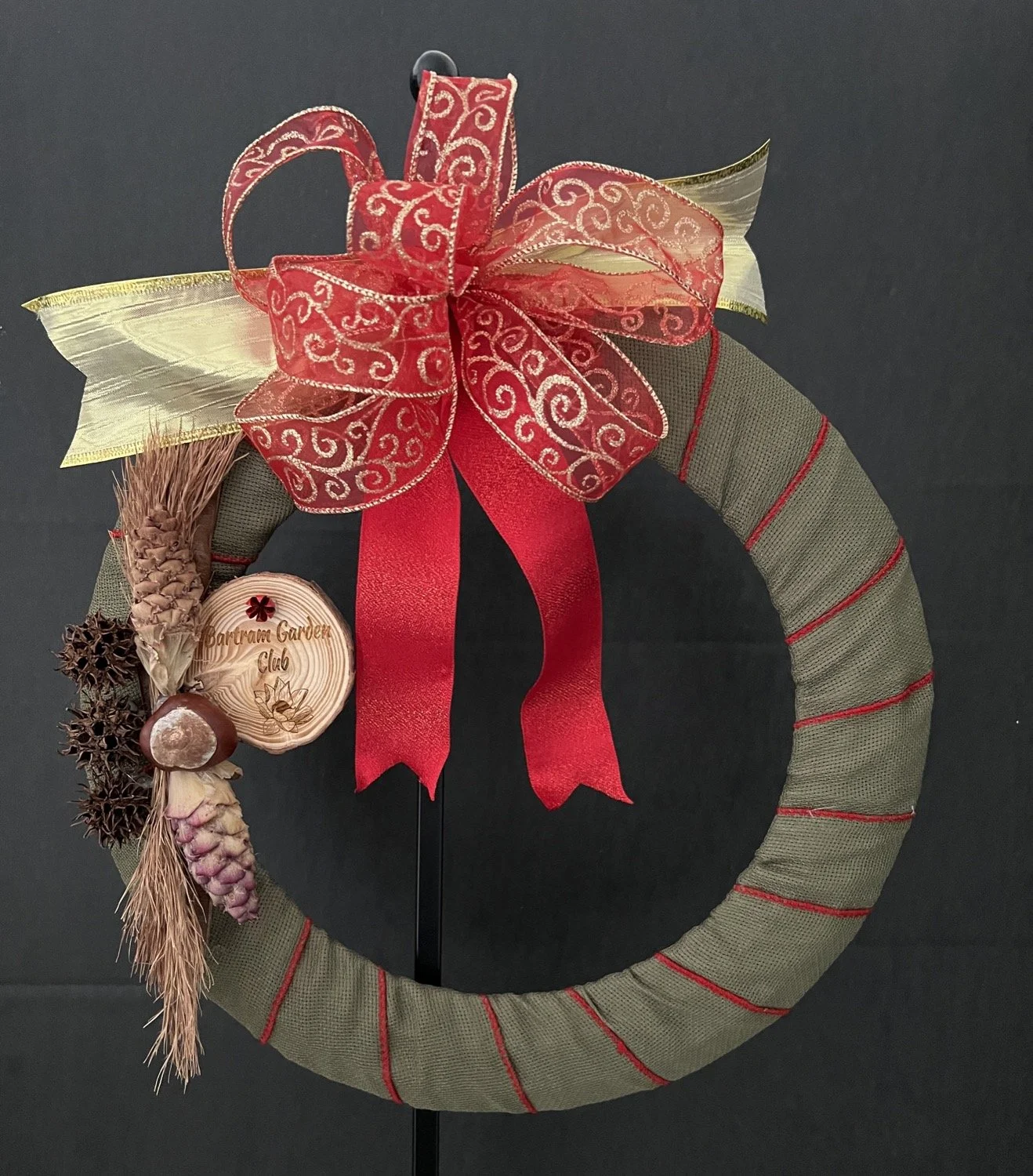 Wreaths were covered in advance with decorative ribbons by member Pam Dawson. Members added festive accessories and dried plant materials. Each wreath was attached with a wooden ornament bearing the club’s name and logo etched by Pam’s husband, Will Knudsen. A message of appreciation was delivered with each wreath using club stationary.