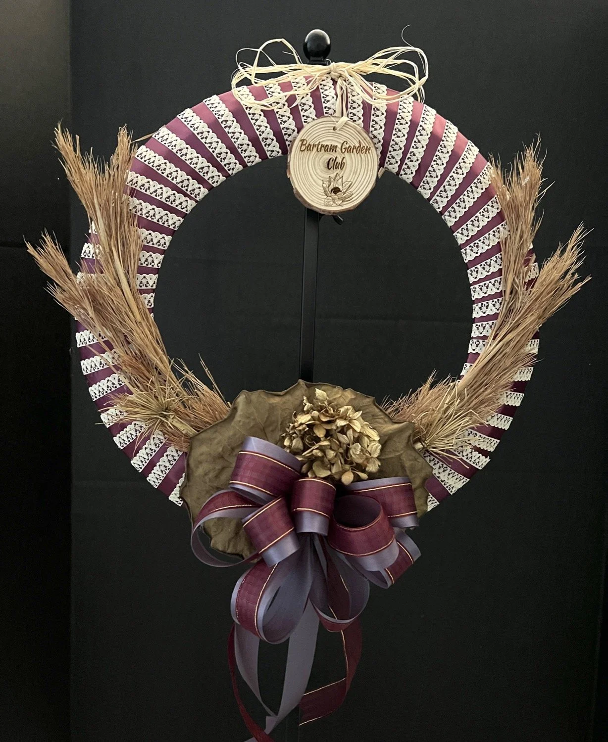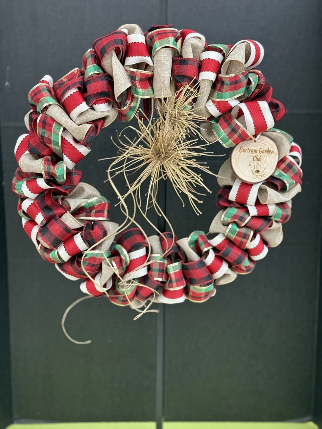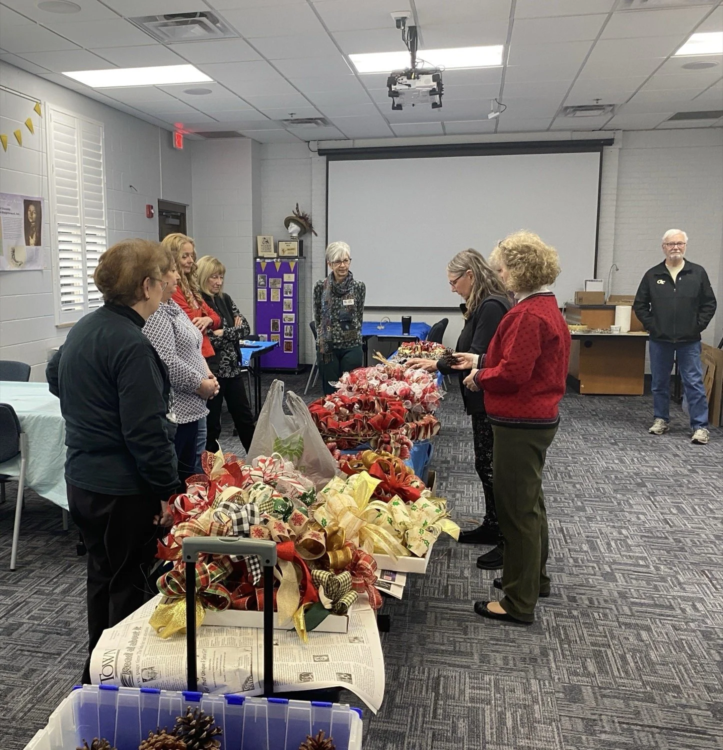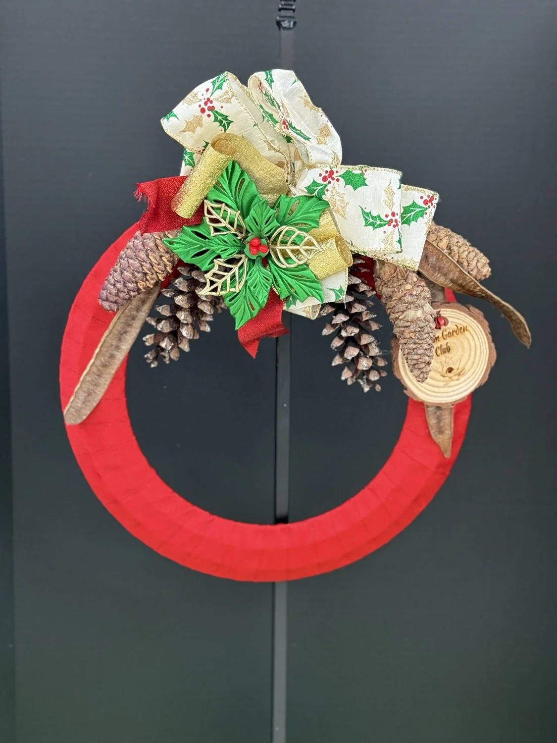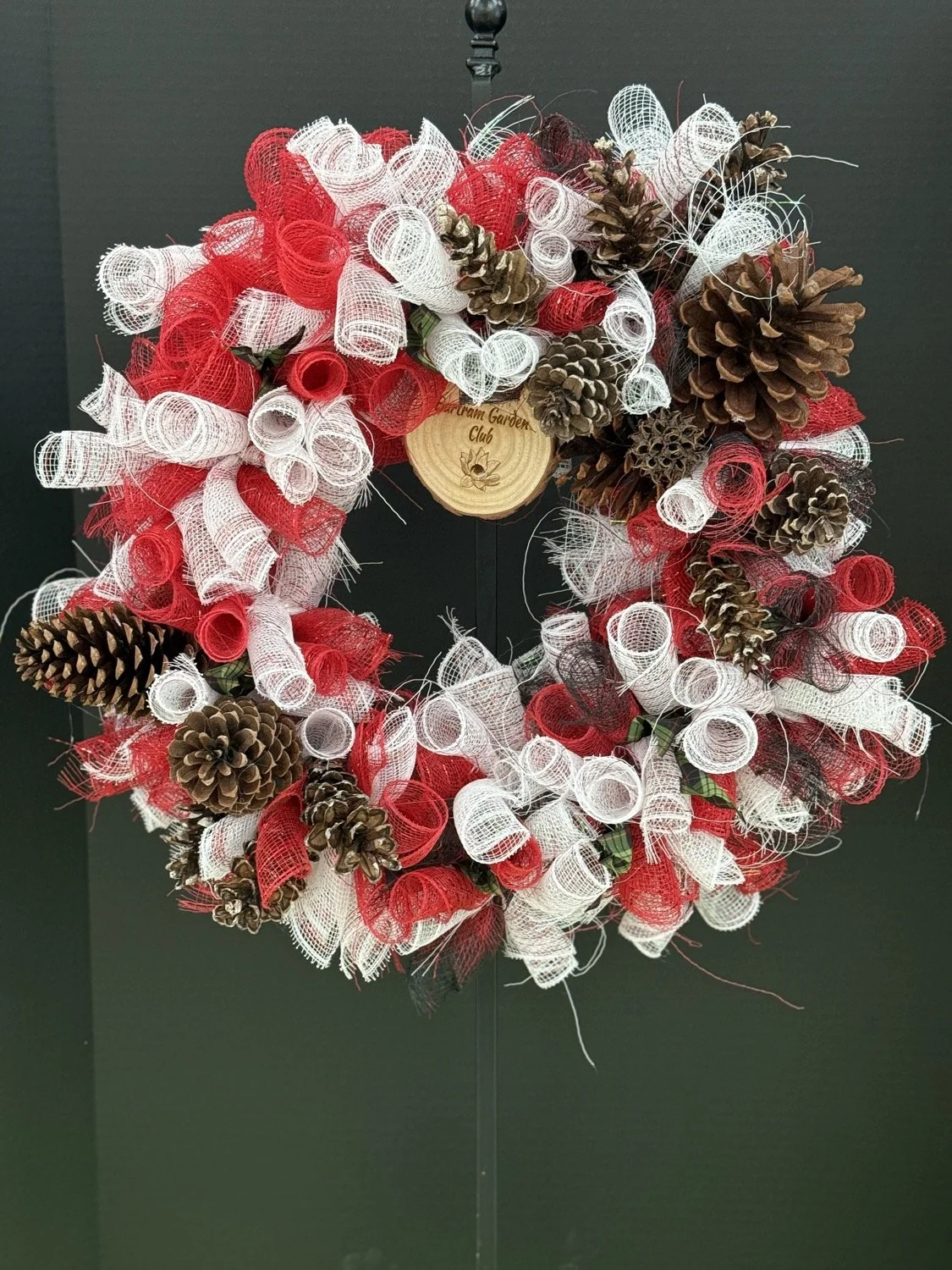 Wreaths were covered in advance with decorative ribbons by member Pam Dawson. Members added festive accessories and dried plant materials. Each wreath was attached with a wooden ornament bearing the club’s name and logo etched by Pam’s husband, Will Knudsen. A message of appreciation was delivered with each wreath using club stationary.