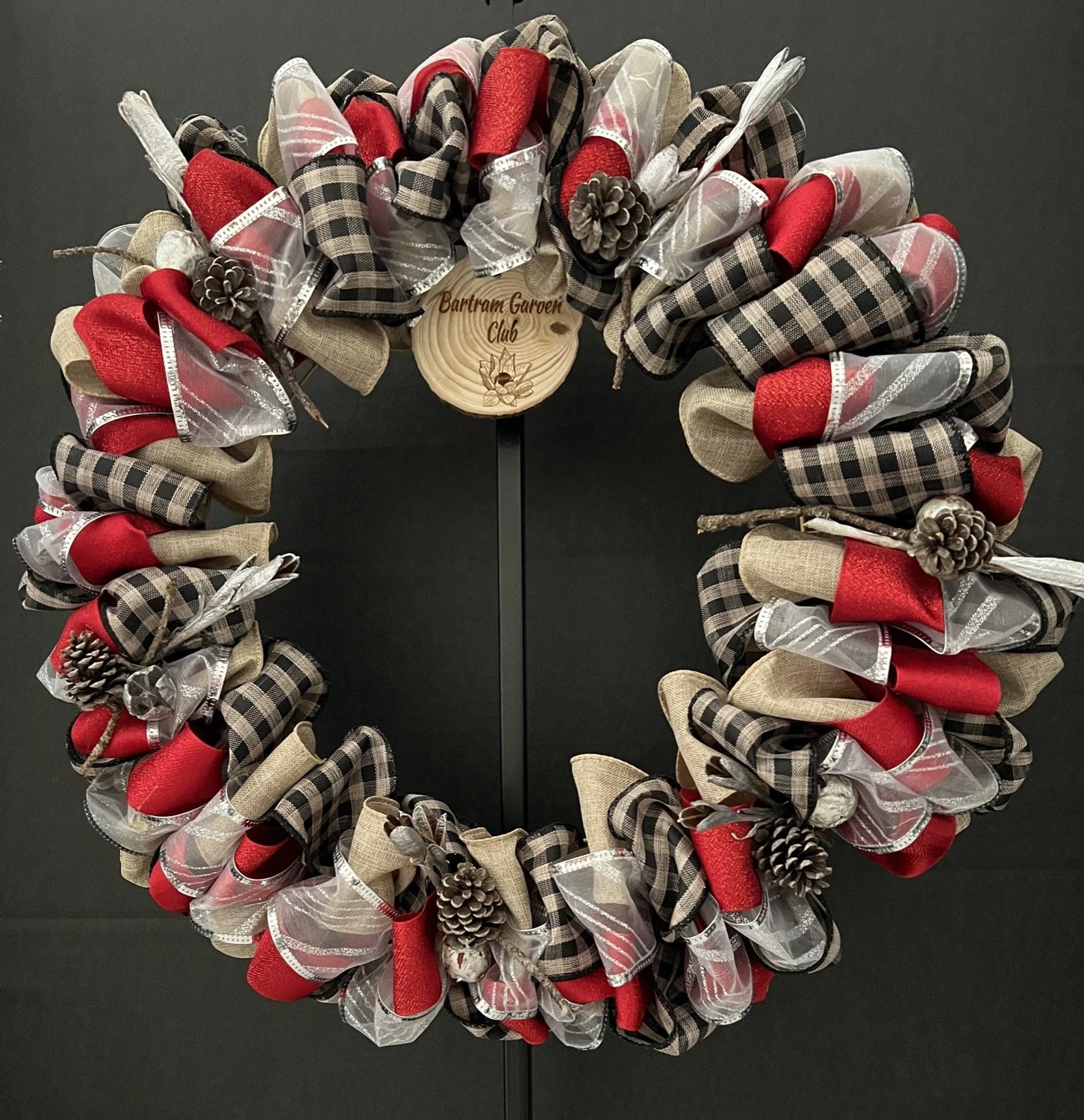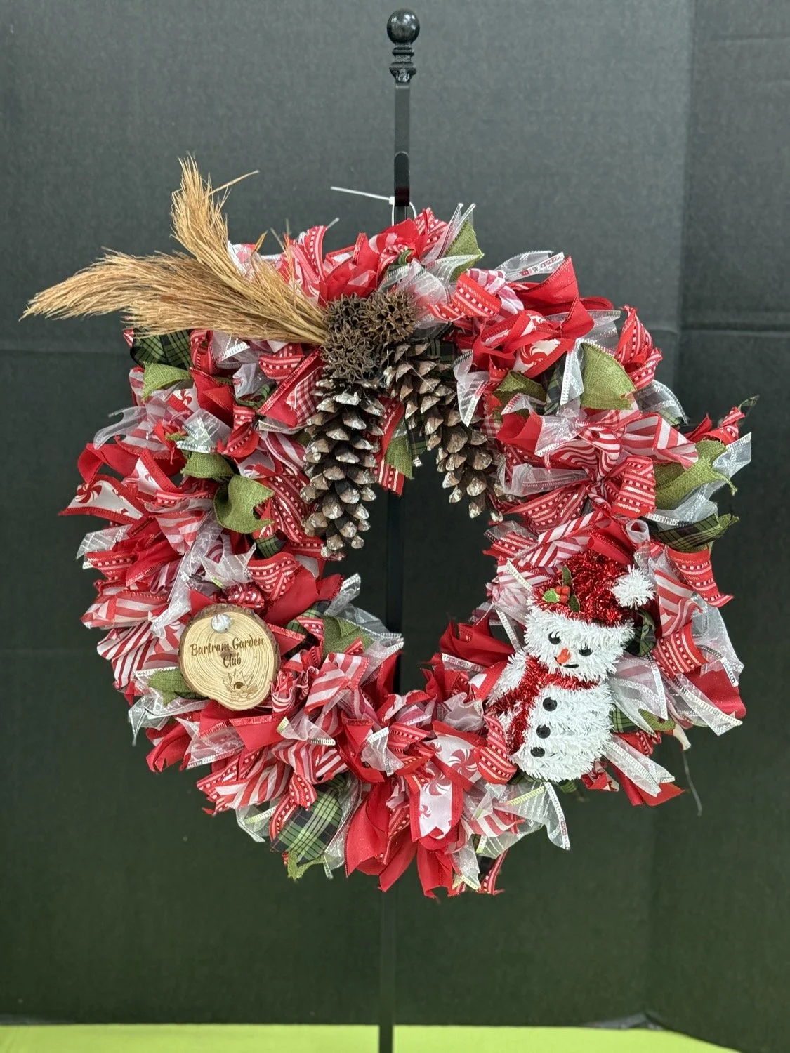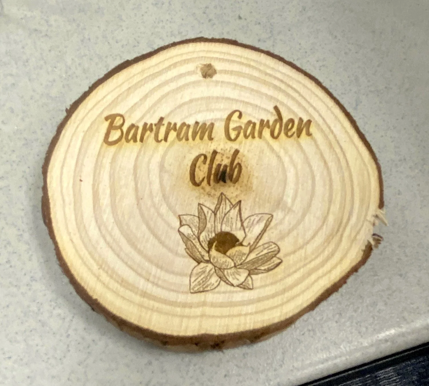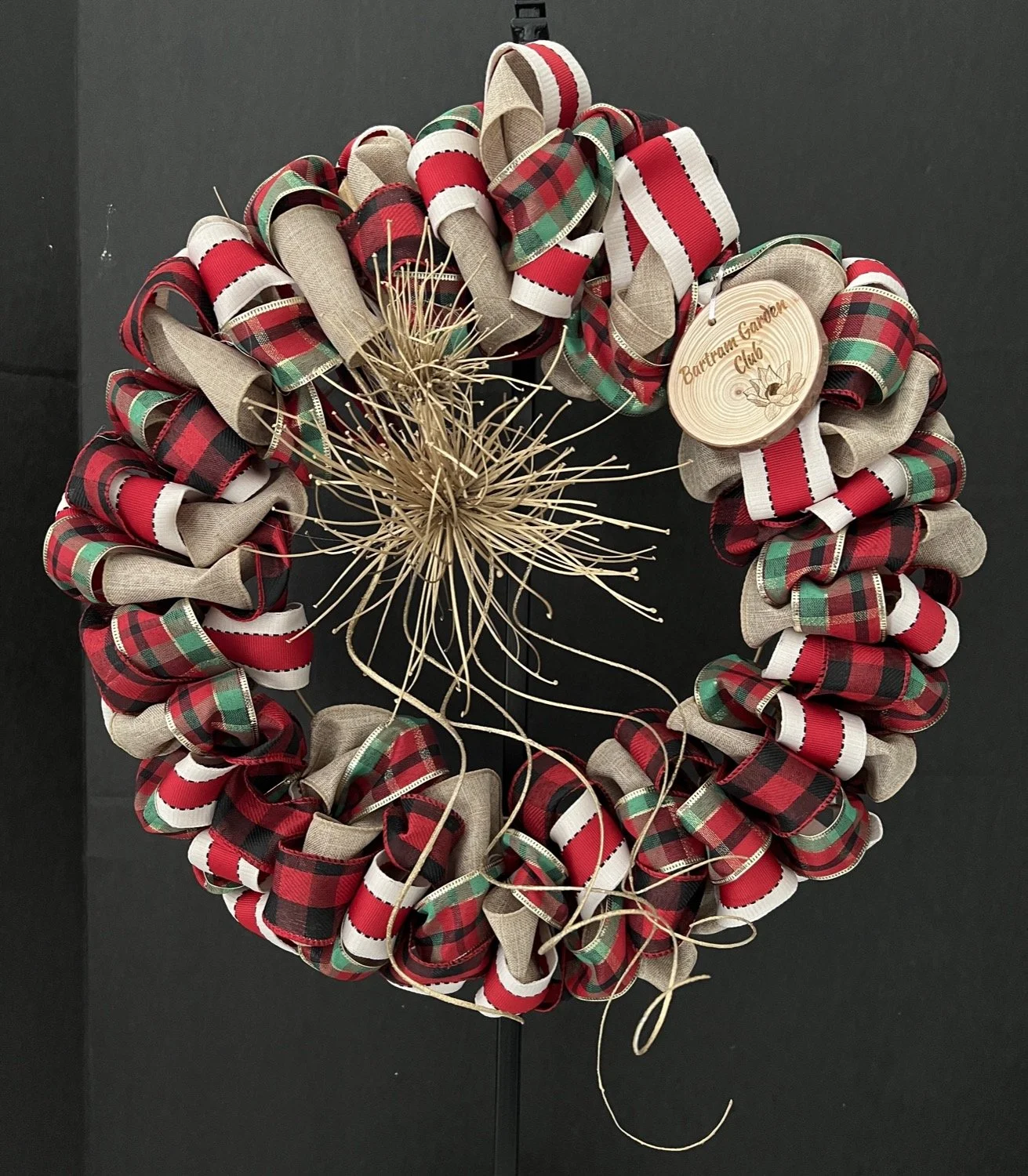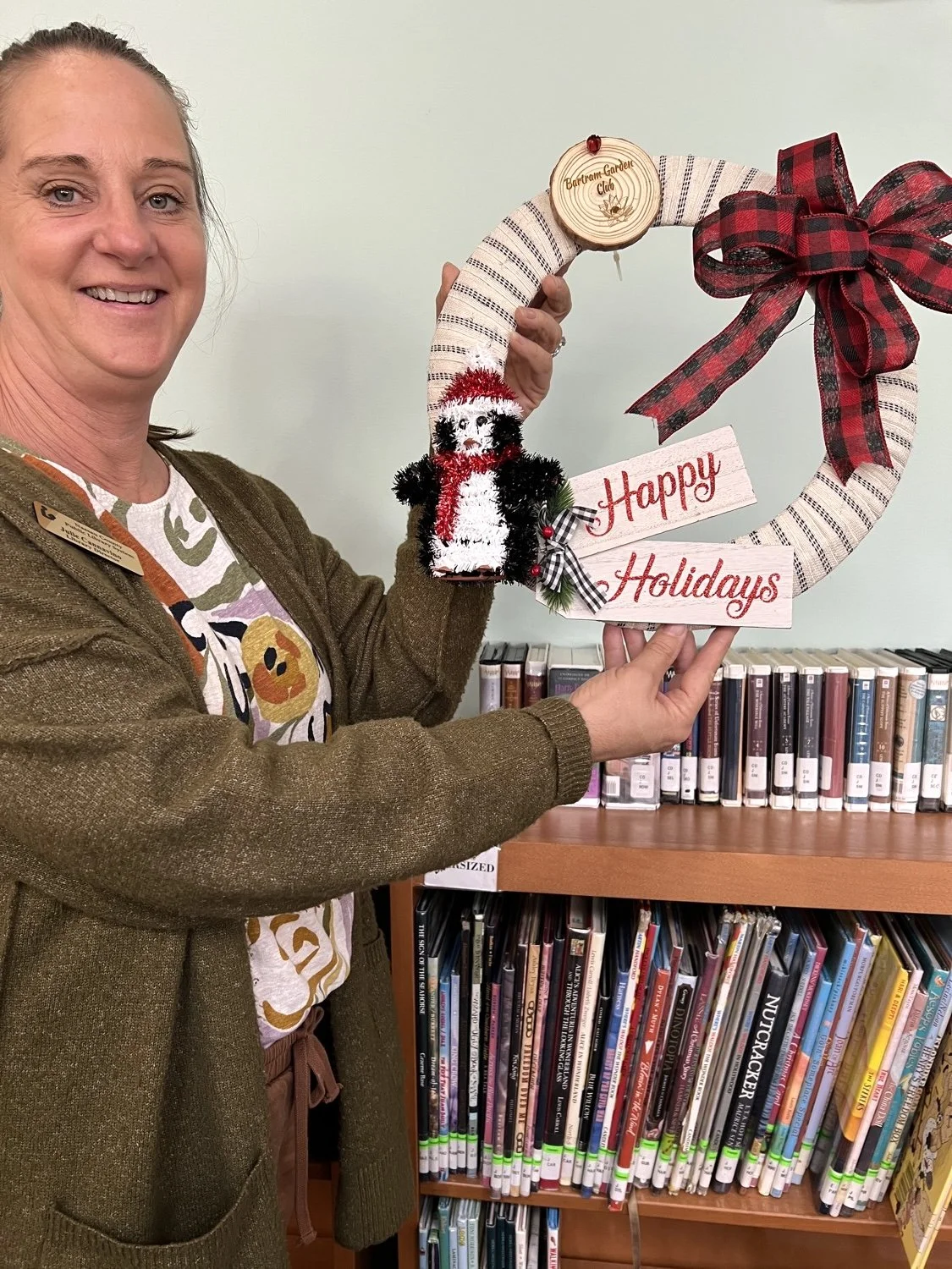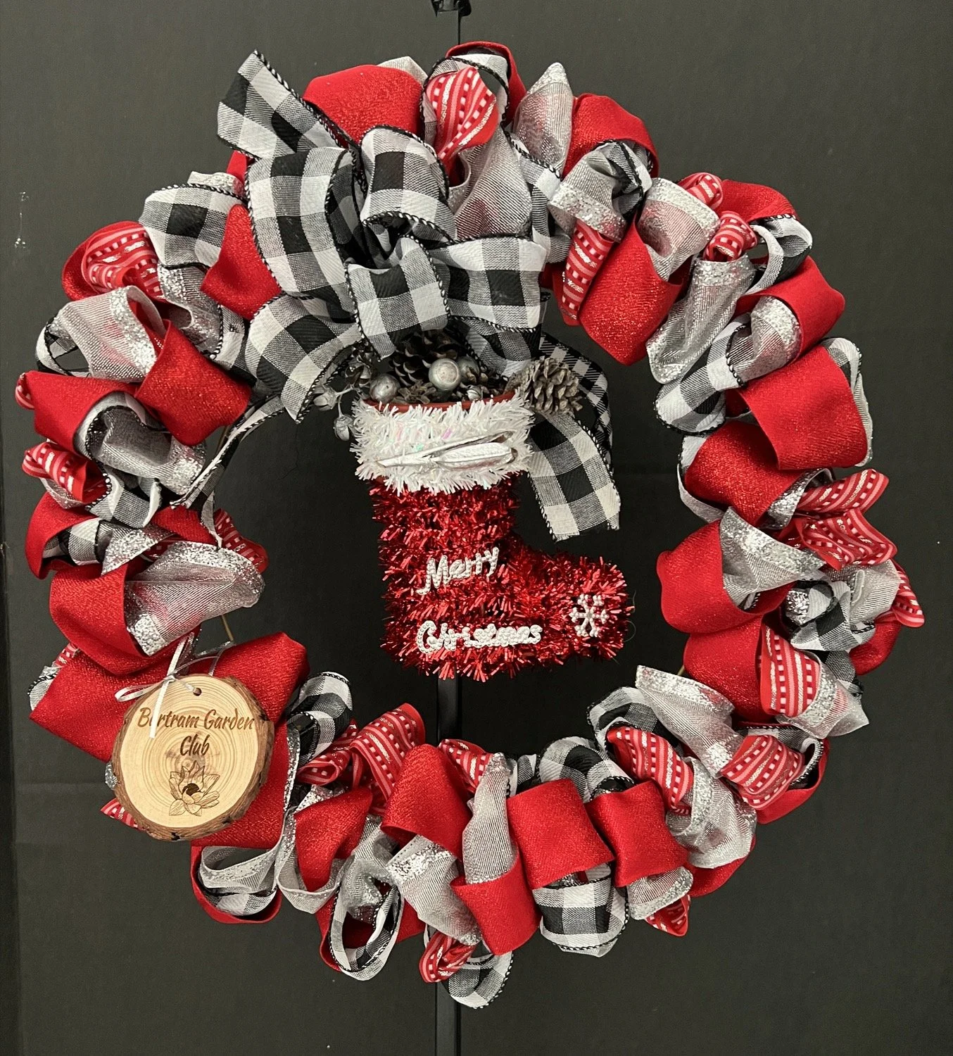 Wreaths were covered in advance with decorative ribbons by member Pam Dawson. Members added festive accessories and dried plant materials. Each wreath was attached with a wooden ornament bearing the club’s name and logo etched by Pam’s husband, Will Knudsen. A message of appreciation was delivered with each wreath using club stationary.