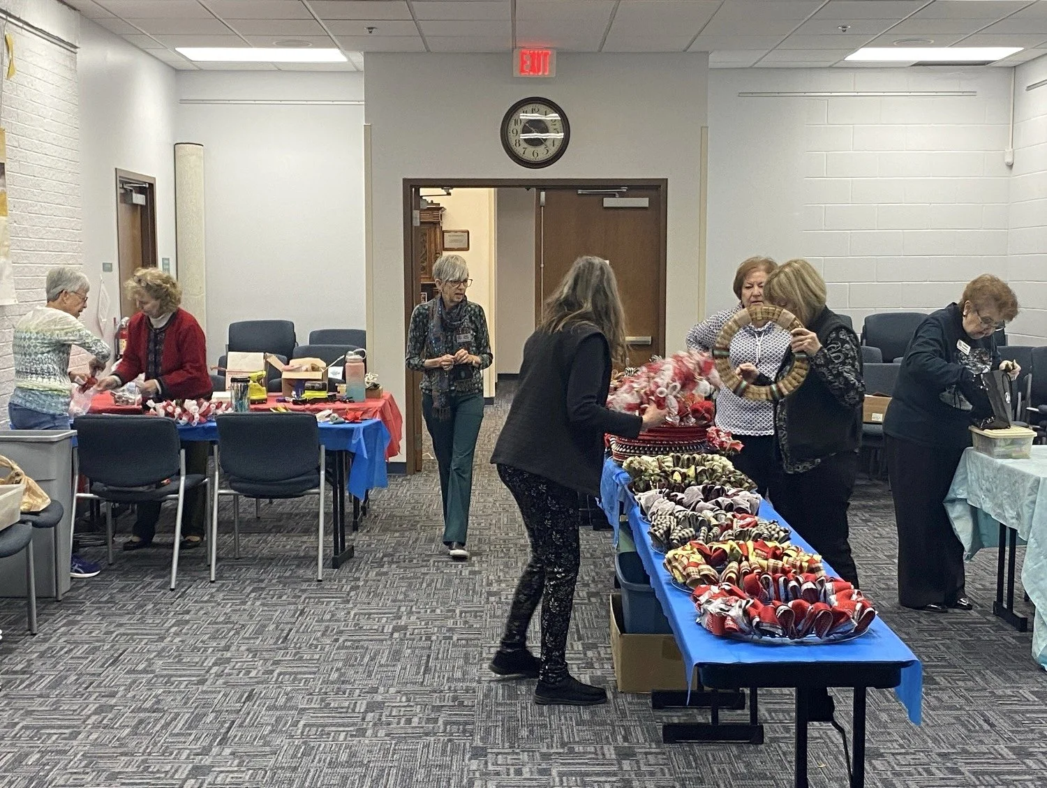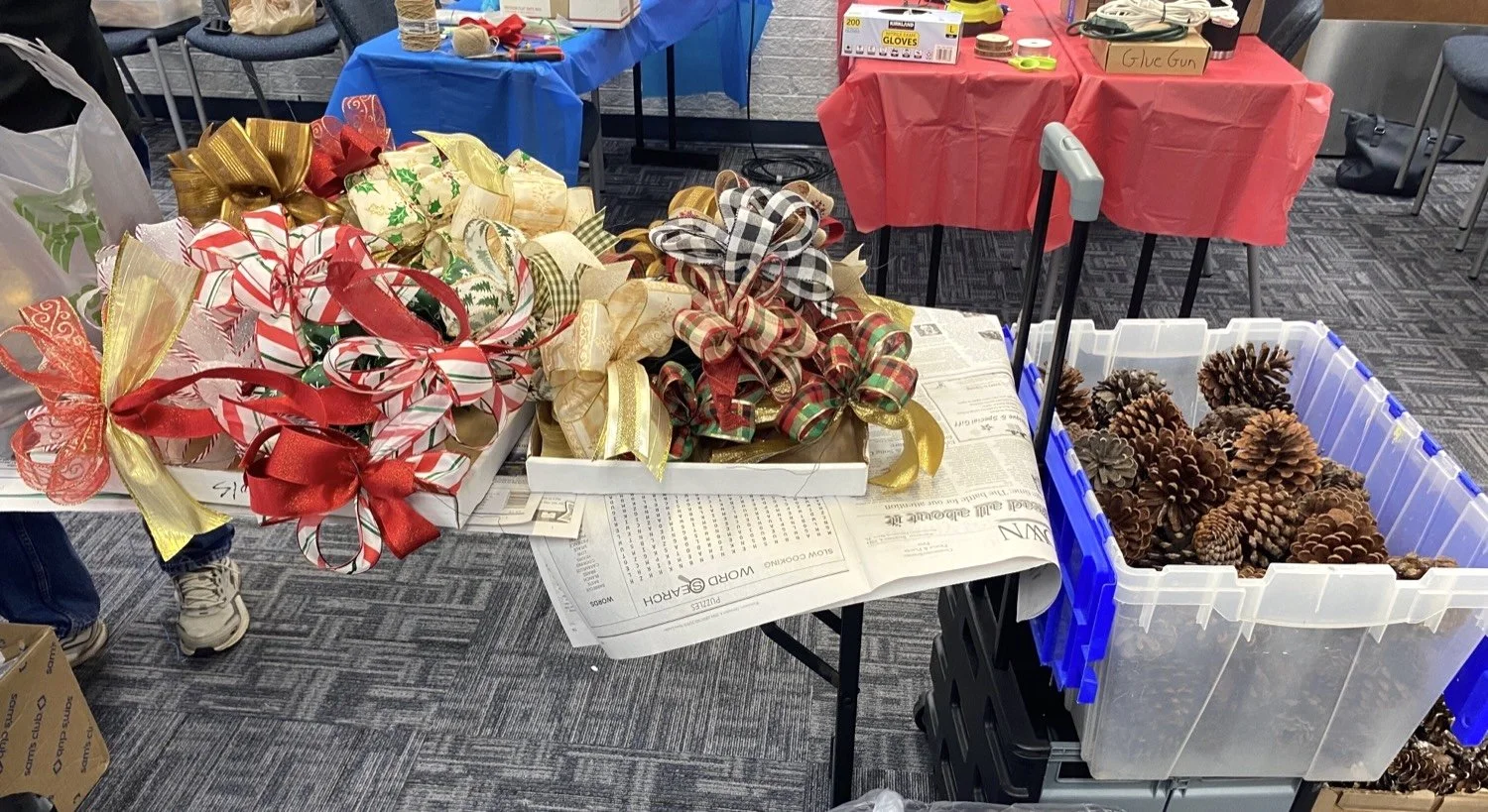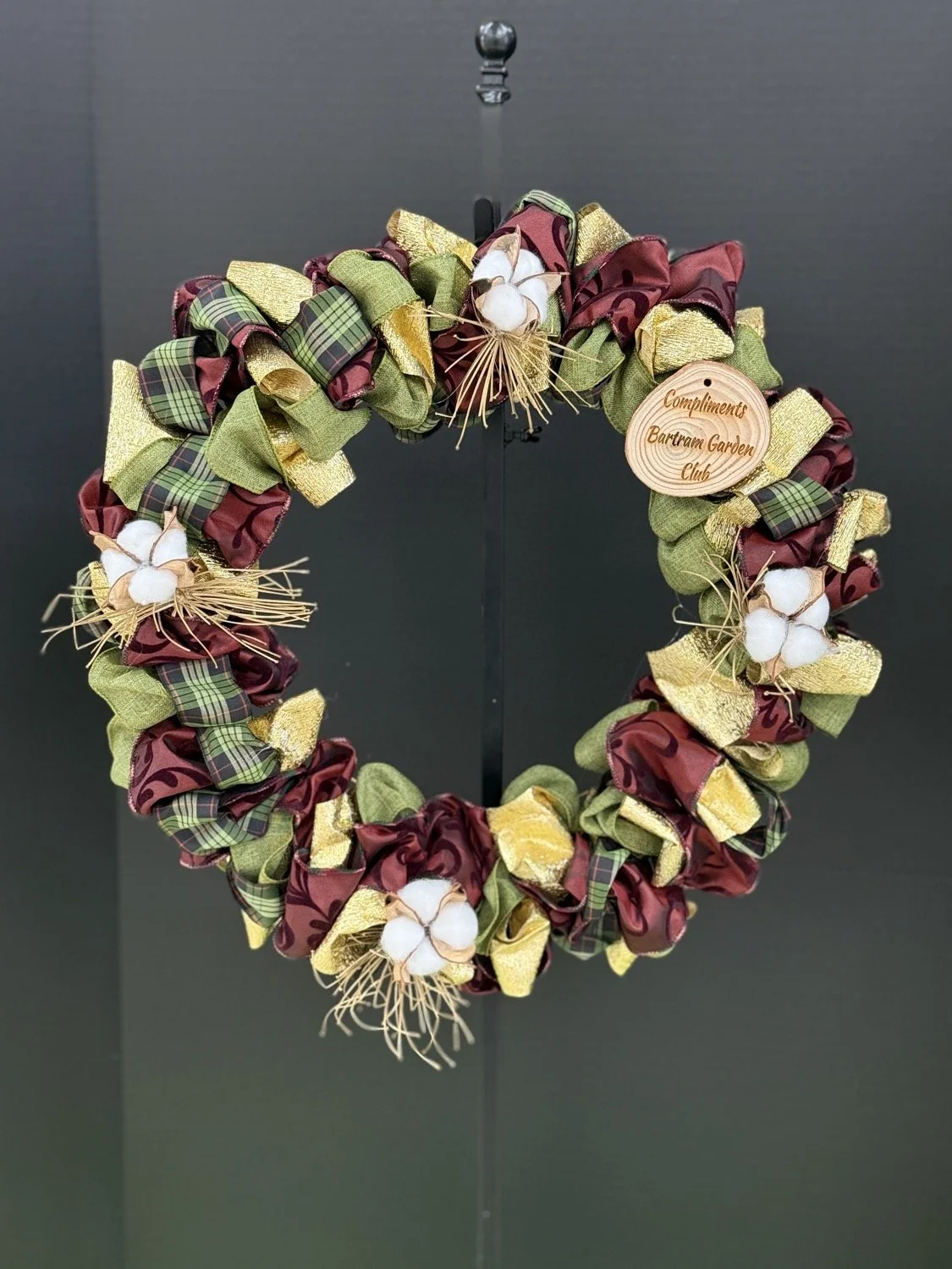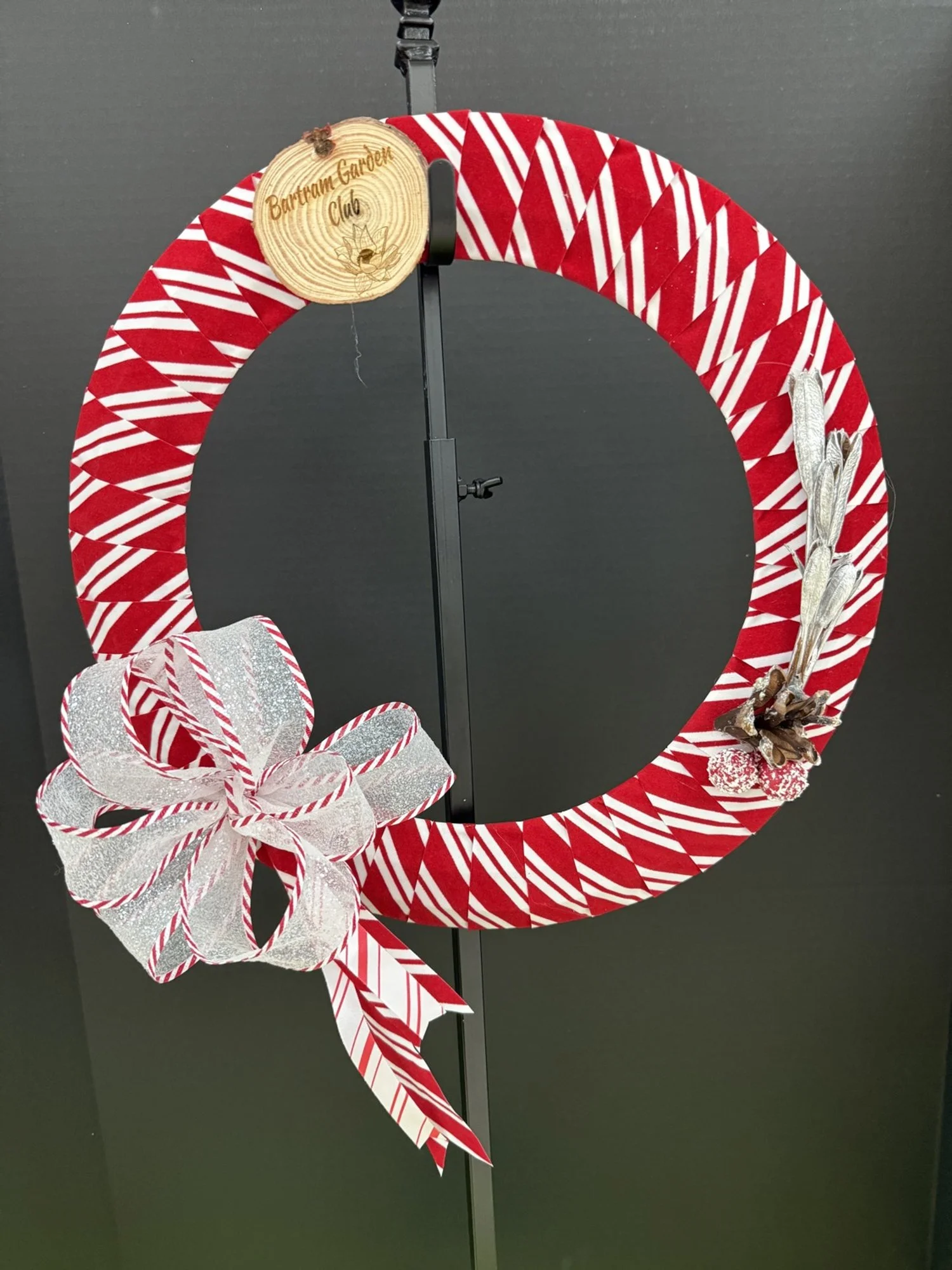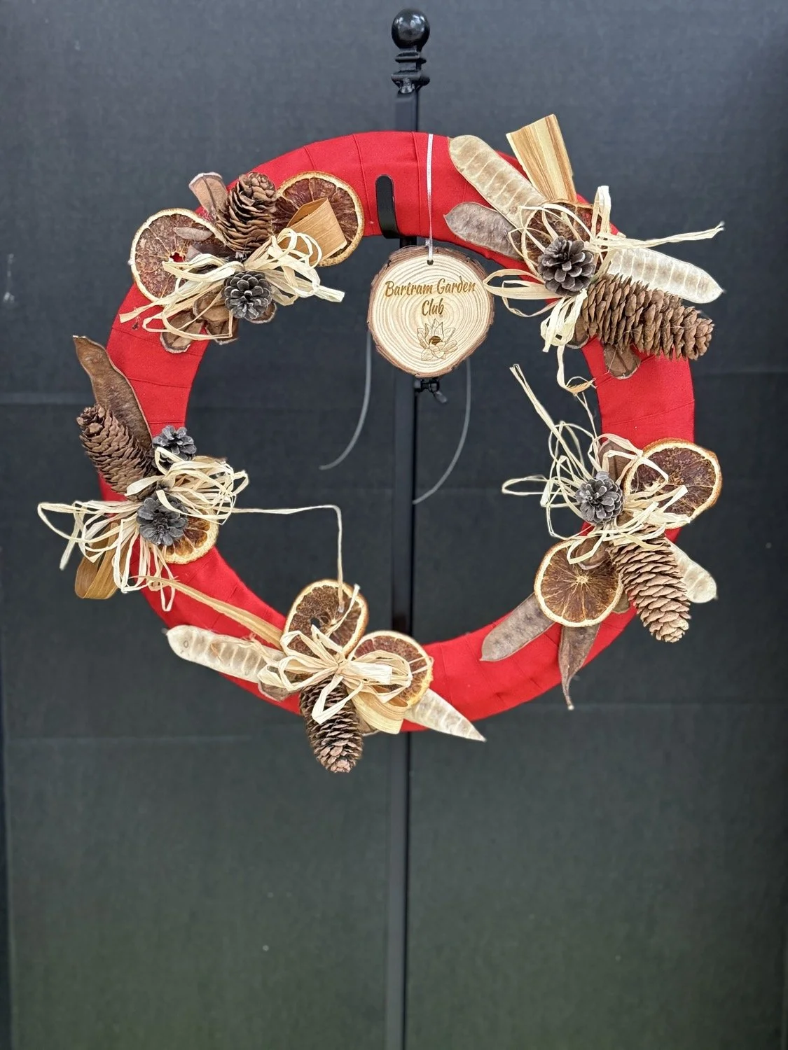 Wreaths were covered in advance with decorative ribbons by member Pam Dawson. Members added festive accessories and dried plant materials. Each wreath was attached with a wooden ornament bearing the club’s name and logo etched by Pam’s husband, Will Knudsen. A message of appreciation was delivered with each wreath using club stationary.