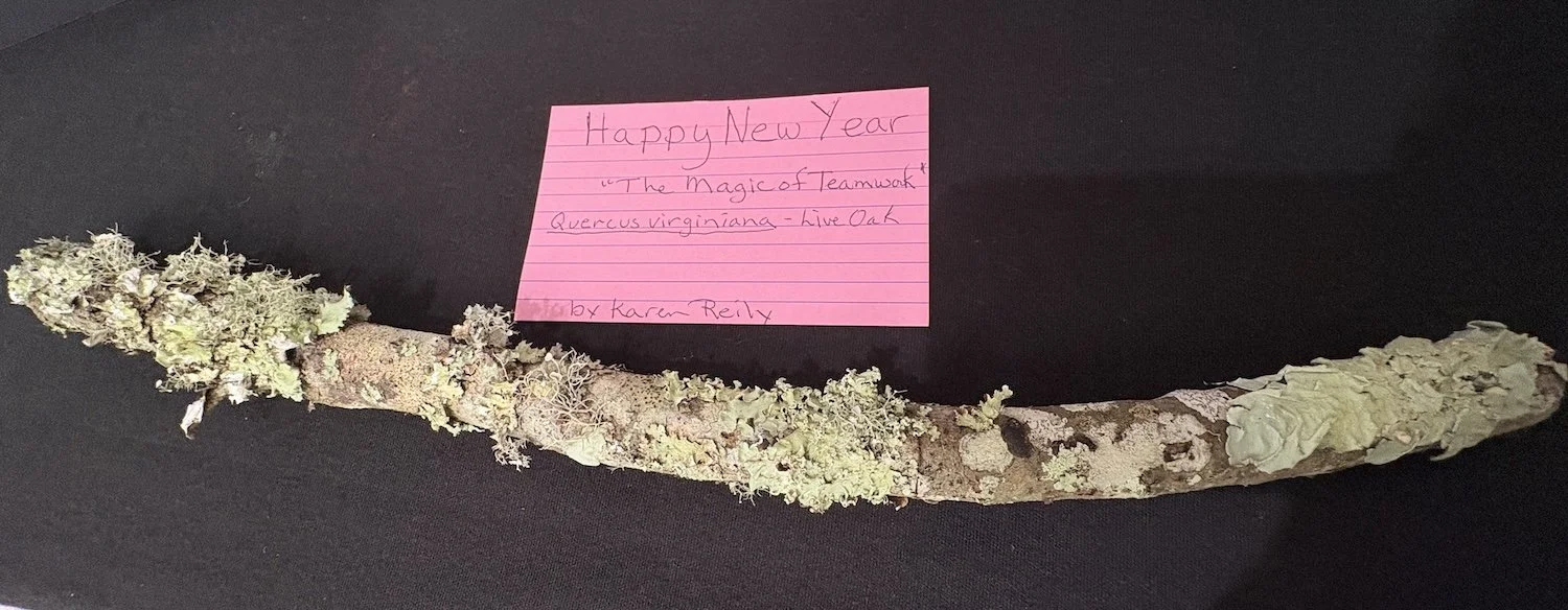 Plant material: Oak tree acorns, Pine tree bark, Pinecones, Tillandsia usneoides - (Spanish Moss, a perennial flowering epiphyle which grows on oak trees. It is *not* Spanish nor a moss or a parasite.), Dried mushrooms (tree-dwelling fungi), Liquidambar (Sweetgum tree) Seed Pod Balls, Dried Sunflowers, Cladonia spp. (Reindeer Lichen) and Usnea Lichen, Tree bark wooden kitchen "spoon", Dried flowers from a Palm tree spathe (fairy "hair").