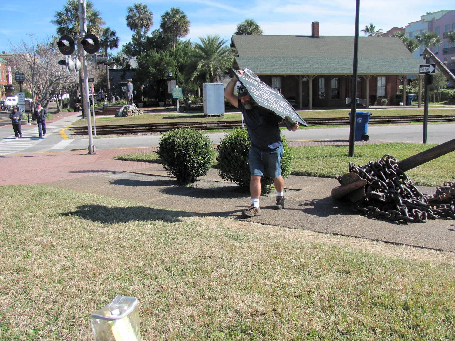 This William Bartram Trail marker was originally erected by the Rose Garden Club of Fernandina Beach in May of 1981 in cooperation with the Florida Federation of Garden Clubs, Inc., Deep South Garden Clubs, Inc. of National Garden Clubs, Inc. (NCSGC), and the City of Fernandina Beach. Between 1980 and 1986, twenty-one similar markers were placed in Florida by FFGC in conjunction with member clubs. The Fernandina Beach marker was fifth in that series, and the tenth William Bartram Trail marker placed nationwide. It stands at the foot of Centre Street across from the historic train depot. By the time The Bartram Garden Club was chartered by FFGC in 2016, the marker was faded and the paint peeling. The Executive officers voted to restore the marker in 2018, since the Rose Garden Club no longer existed.